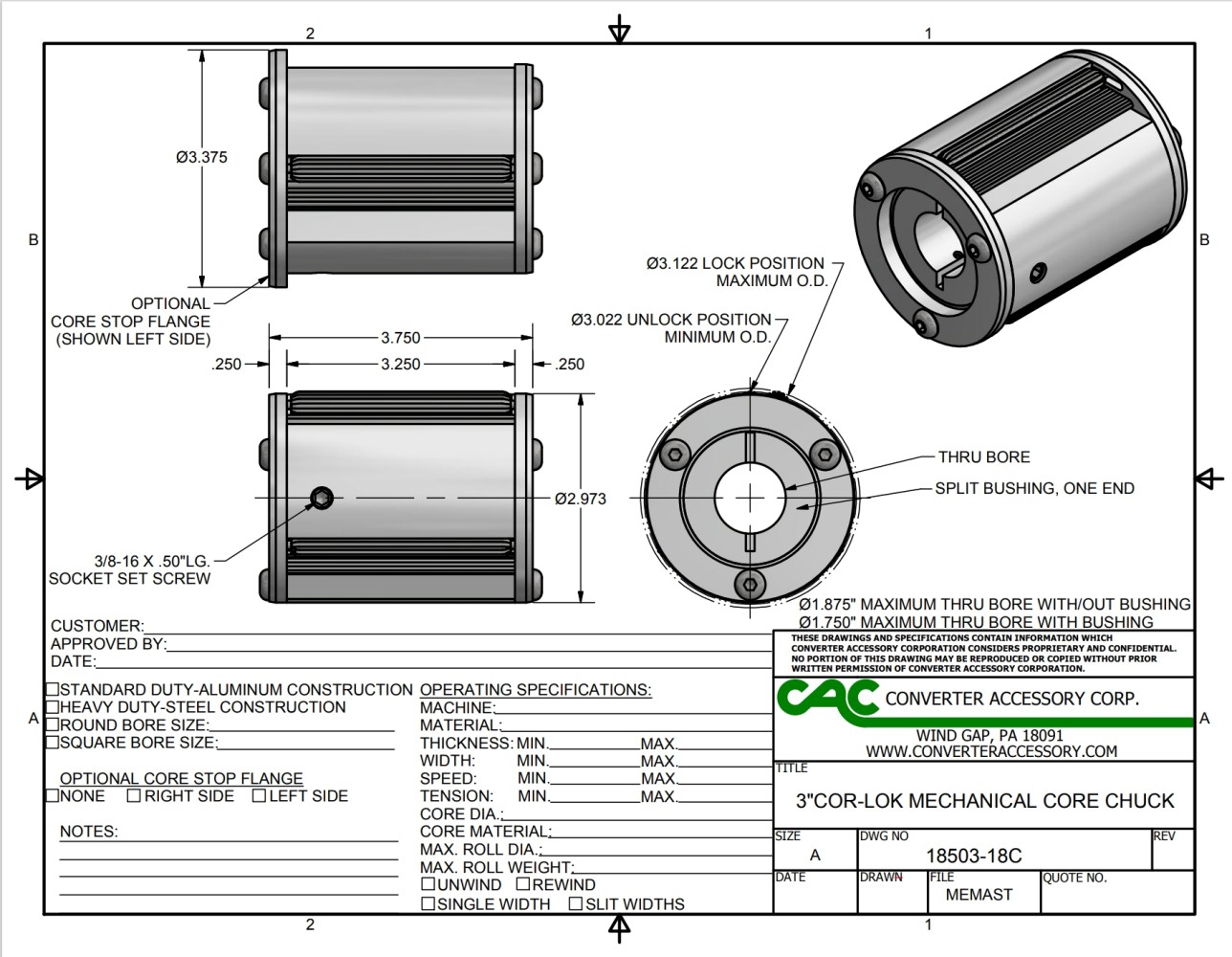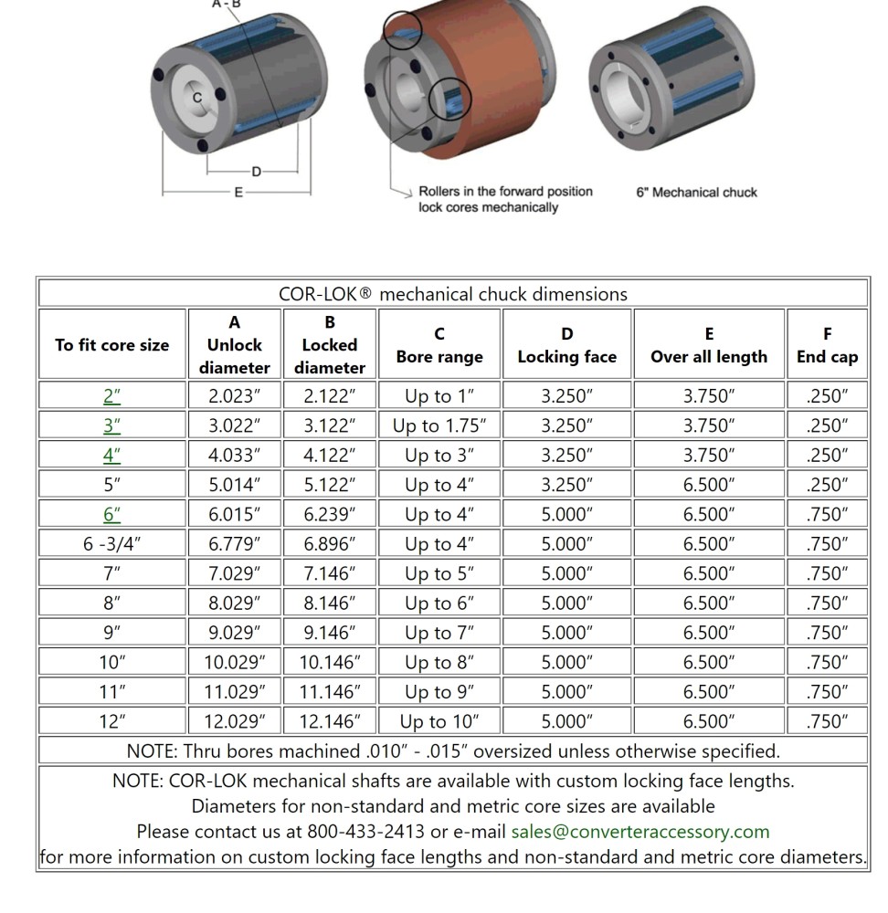 Cores often vary inside diameter (I.D.) sizes. Be sure your mechanical core chuck expansion range; unlocked position to locked position will accommodate your core I.D. variance.