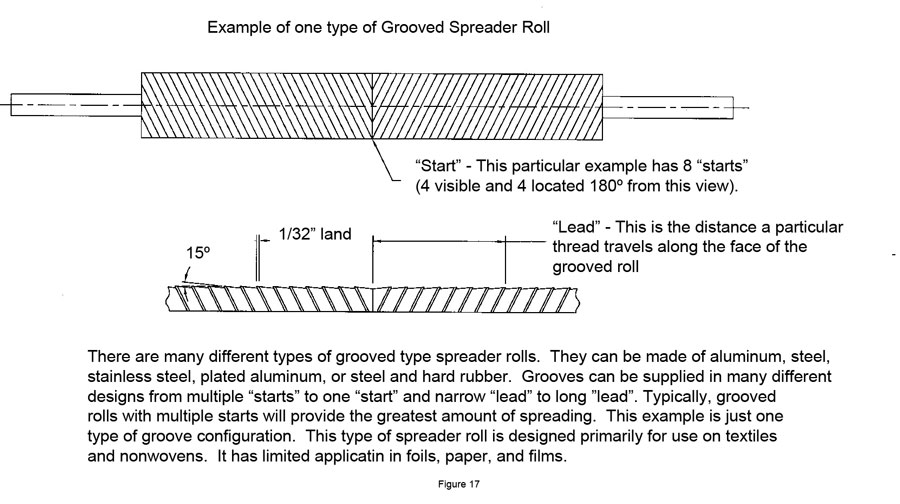 A grooved spreader roll can be manufactured from a variety of materials, such as steel, aluminum, stainless steel, plated aluminum or steel and hard rubber. A rigid grooved spreader roll has grooves machined into the roll face surface. These grooves (resembling screw threads) are machined - starting from the center of the roll and leading out to each edge of the roll face. The grooves can be supplied in almost any fashion: from as simple as wrapping masking tape across the face of a standard idler roll to a machined groove that has very intricate machining details. See figure 17 for just one possible groove design. Groove design is completely application dependent, however it can be generally stated that the greater the number of groove starts there are (see figure 17) the greater the spreading will be realized.