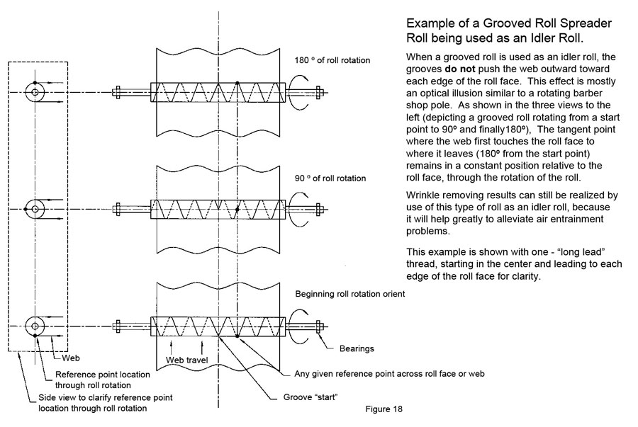 - When this spreader is applied as an idler roll (driven at the surface speed of the web), the grooves do not push wrinkles out from the center of the roll face (even though this is most often believed to be the case). As shown in figure 18, when the surface of the grooved roll is driven at the same speed as the surface of the web (such is the case when used as an idler roll) the tangent point, at any given point across the web or roll face, where the web first touches the roll remains in a constant position through the roll rotation. Because the tangent point of the web lying on top of the groove does not vary, the groove has no cross machine direction movement effect on the web. The belief that the grooves have some effect on the web is mostly an optical illusion (like the illusion caused by a rotating barber shop pole). An engineer once told me an excellent analogy of the non-effect of the grooves on the web in this application (I can’t take credit for the analogy); if you place a plow in a field, does the field plow itself by the rotation of the earth? Of course not, and the reason is because the tangent point of the plow in the field remains constant with the earth in its rotation. See figure 18.