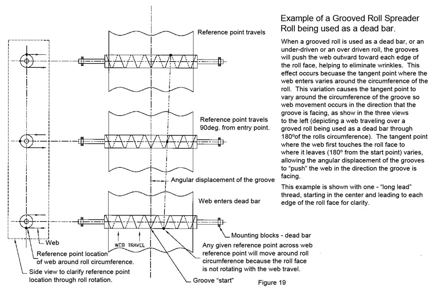- When the surface speed of this type of roll is not synchronized with the web speed (standing completely still is included here) then we get a different level of performance with this type of roll. When this is the case, the grooves will push the web outward toward each edge of the roll face. This effect occurs because the tangent point where the web touches the roll face is ever-changing as the web travels around the circumference of the roll. The changing position of this tangent point ensures that the web, at that point, will travel in the direction the groove is facing. See figure 19.