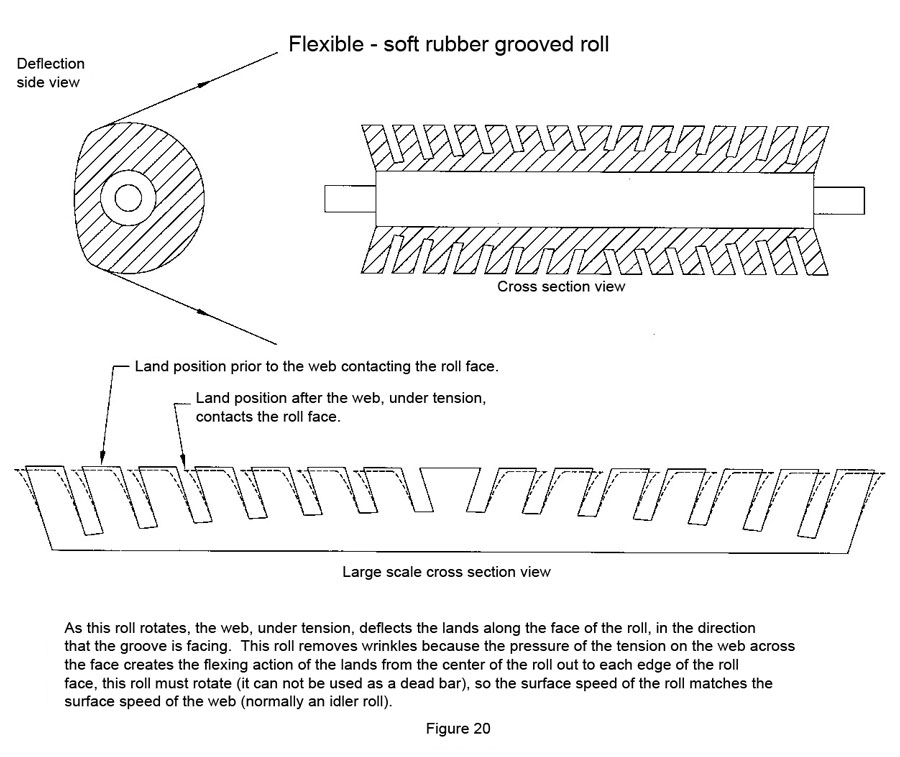 As this roll rotates with the same surface speed as the web, it has flexible lands(created by grooves machined into the surface of the soft rubber face), which deflect under the webs tension. The lands deflect in the direction they are angled, from the center out to each edge of the roll face. The depth of the grooves increases from the center out to each edge of the roll face. The reason for the depth adjustment out to each edge of the roll face is so each land will flex more than the land next to it, ever increasing from the center of the roll. The difference in flex amount between each land is important because it provides for web spreading between each land. In other words if all the lands flexed exactly the same amount, spreading would be achieved only in the center of the web, there would be no spreading from land to land. See figure 20.